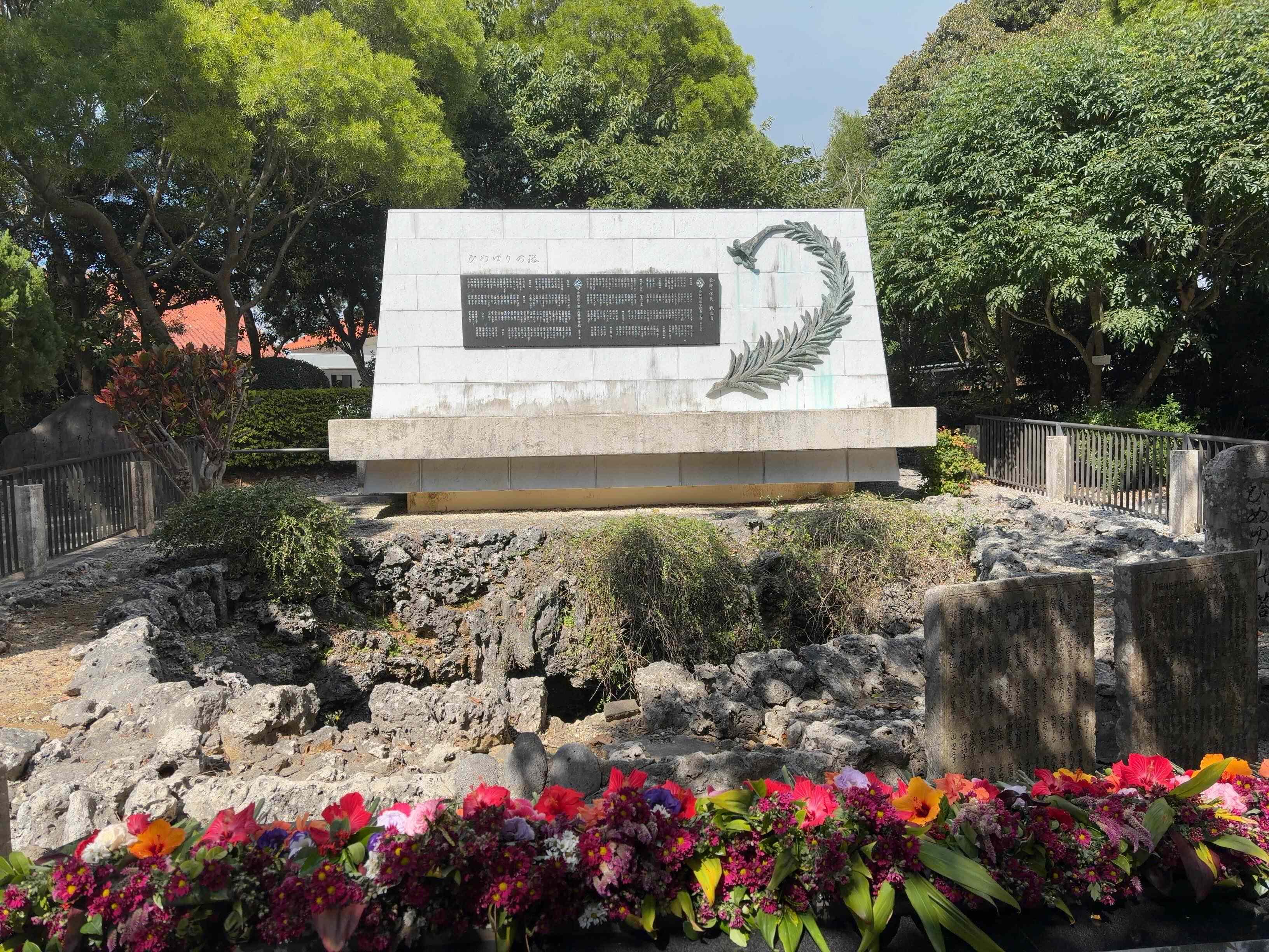 「真壁ちなー」から「ひめゆりの塔」までは5分、目と鼻の先だ。「ひめゆりの塔」は、1945年の沖縄戦で亡くなった沖縄師範学校女子部・沖縄県立第一高等女学校の生徒や教師のための慰霊碑で、沖縄戦の翌年、両校で最も多くの犠牲者を出したガマ(鍾乳洞)の上に建てられた。間近に覗くとかなり深い穴である。慰霊碑の奥には生存者の手記や従軍の様子などを展示した「ひめゆり平和祈念資料館」があるが、すでに1時間遅れのためパス。