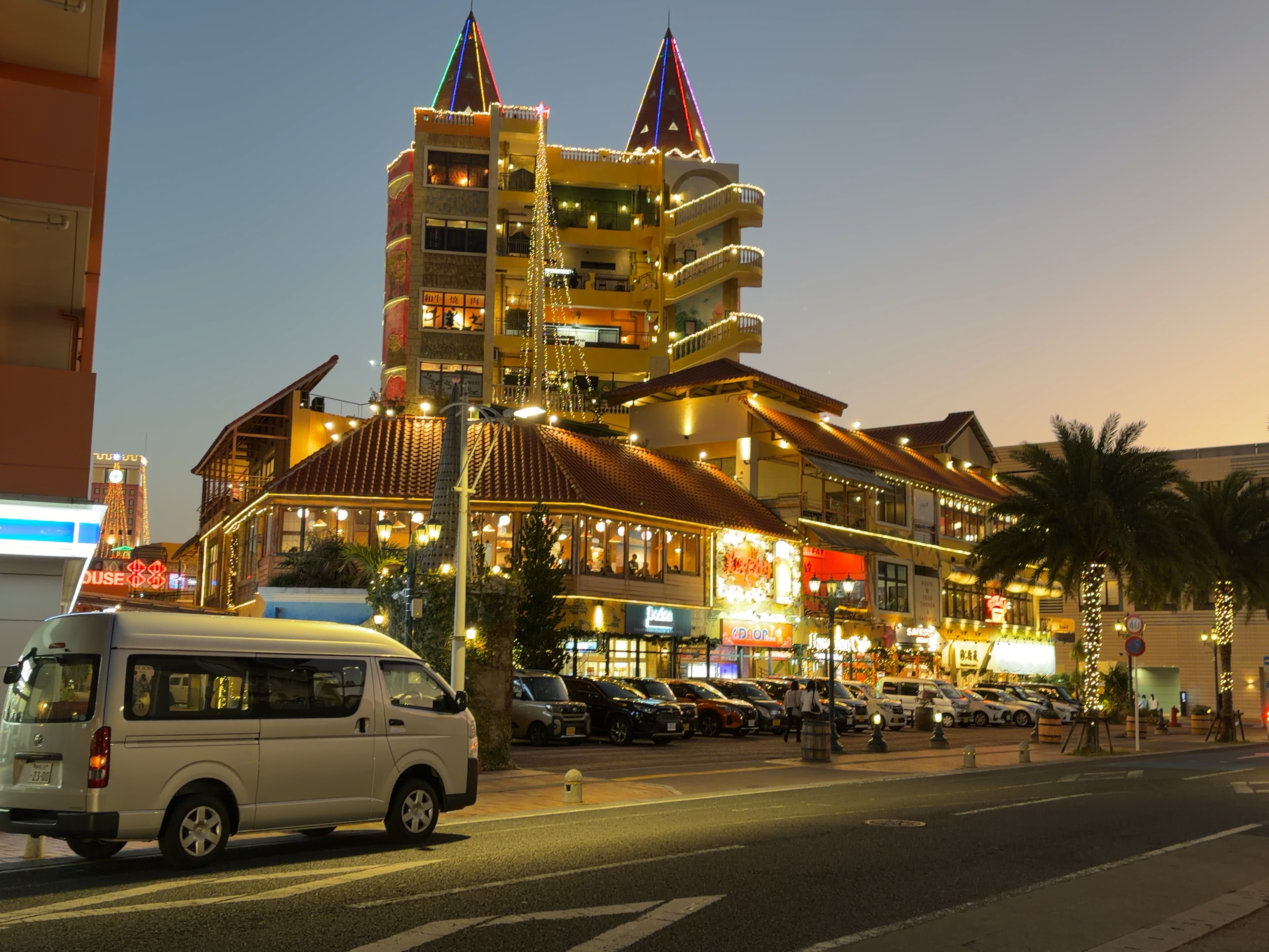 ホテルにチェックインした後、アメリカンビレッジ経由で残波岬に行く予定だった。残波岬は、沖縄本島で夕日が最後に沈む場所として知られる絶景スポットで、日没の予定時刻は18時20分だった。ホテルの到着が遅かったことに加え渋滞で、アメリカンビレッジに着く前に日が沈んでしまった。