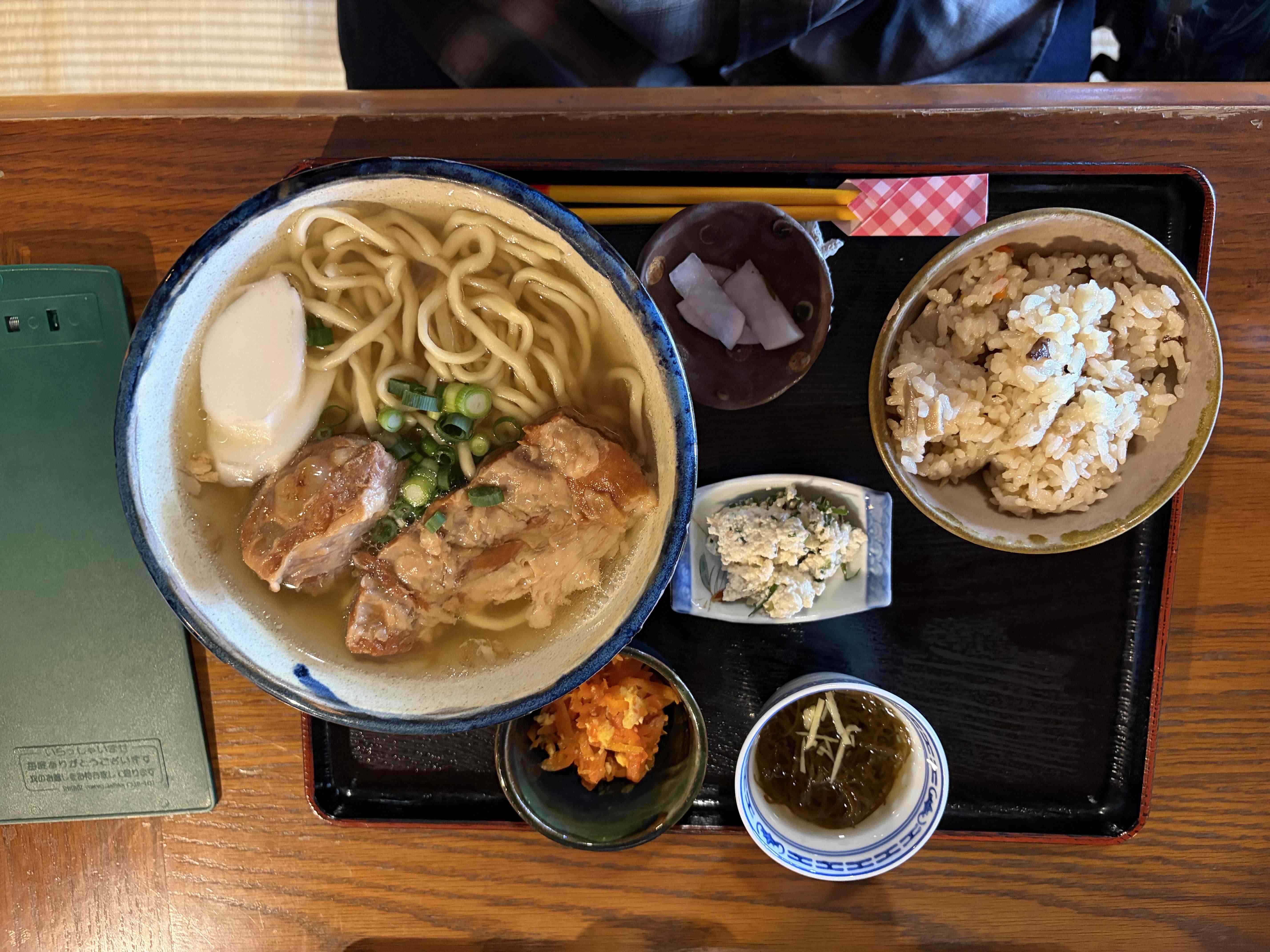 人気店なので少し早めに行く予定だったが、40分遅れたため、ちょうど混雑する時間帯になってしまった。車が止められただけでも運が良かったかもしれない。店の外で待つこと15分、やっと席に着けた。一番人気の「軟骨ソーキそばセット(中)」を注文し、料理が出てくるまでの間、店の中を観察。文化的価値はさっぱり分からなかったが、居心地の良い空間であることは確かだった。肝心の料理は意外なほど普通。人気店だが名店ではなさそうだ。