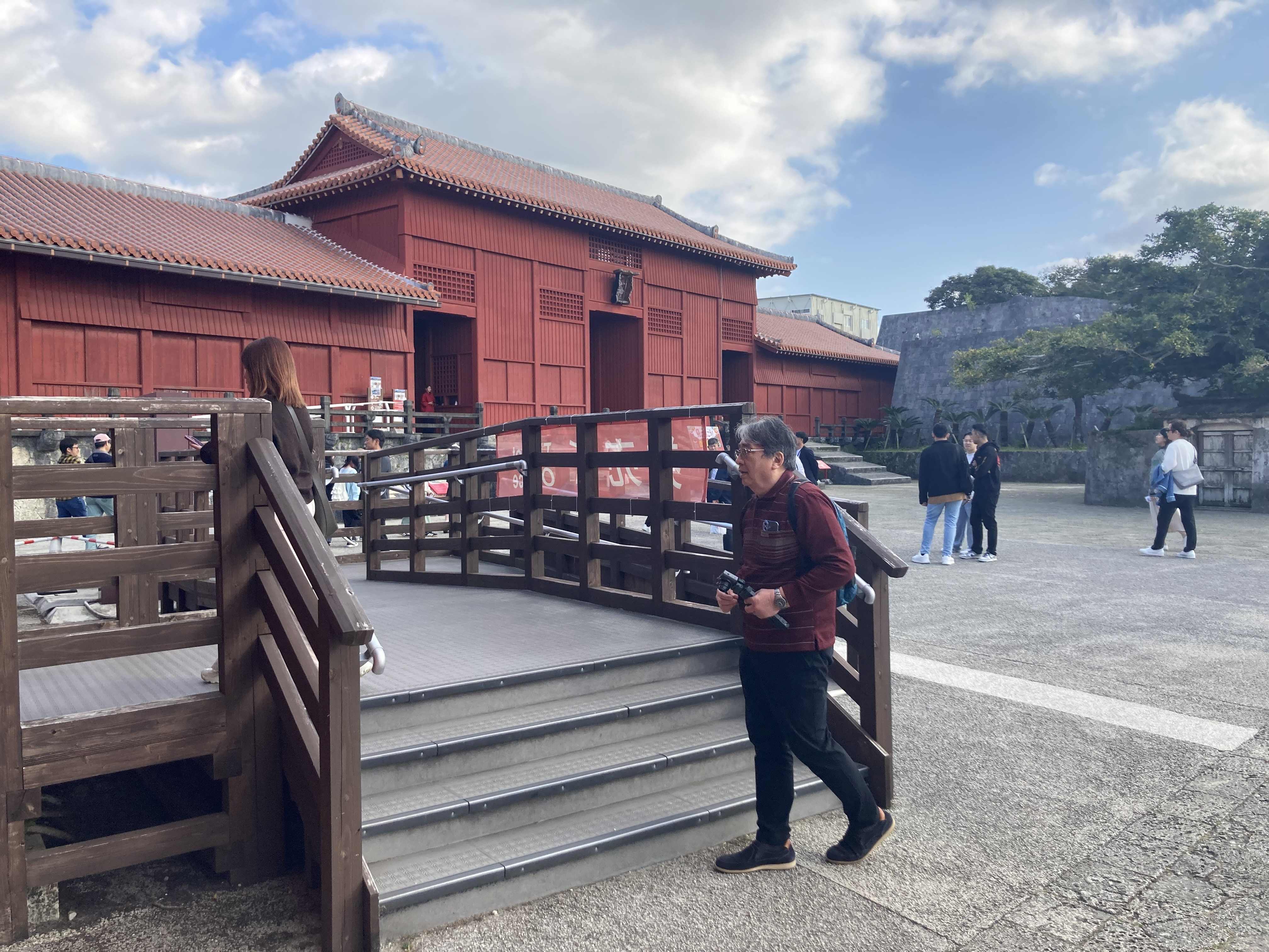 守礼門までは往時の雰囲気と変わらない。歓會門、瑞泉門、漏刻門、廣福門と進み、奉神門の前まで来ると、クレーンのアームや建設用の足場が現れ、奉神門の先は立入禁止になっている。工事現場の外周に足場が作られ、ここから先が有料区域になる。