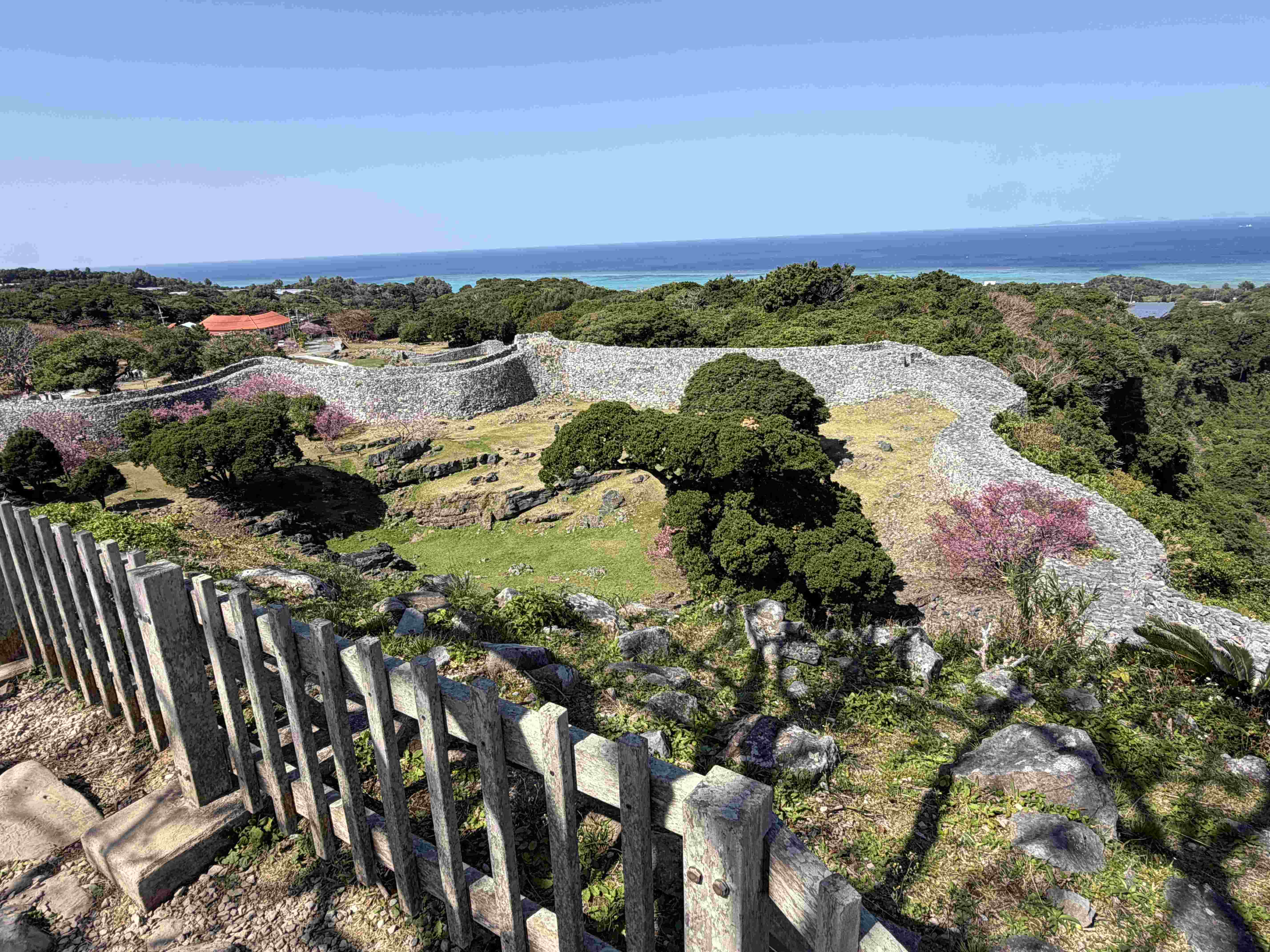 小さな城跡に見えたが、歩くと意外にきつかった。それもそのはずで、斜面に建てられているため、奥に行くほど山を登るかんじになった。石垣の上は、万里の長城のような通路が作られており、中国の影響を感じた。一番高いところからは、原生林越しに海を臨むことができ、タイムスリップ感がある。都会の中にある首里城の景観とは趣きが違う。