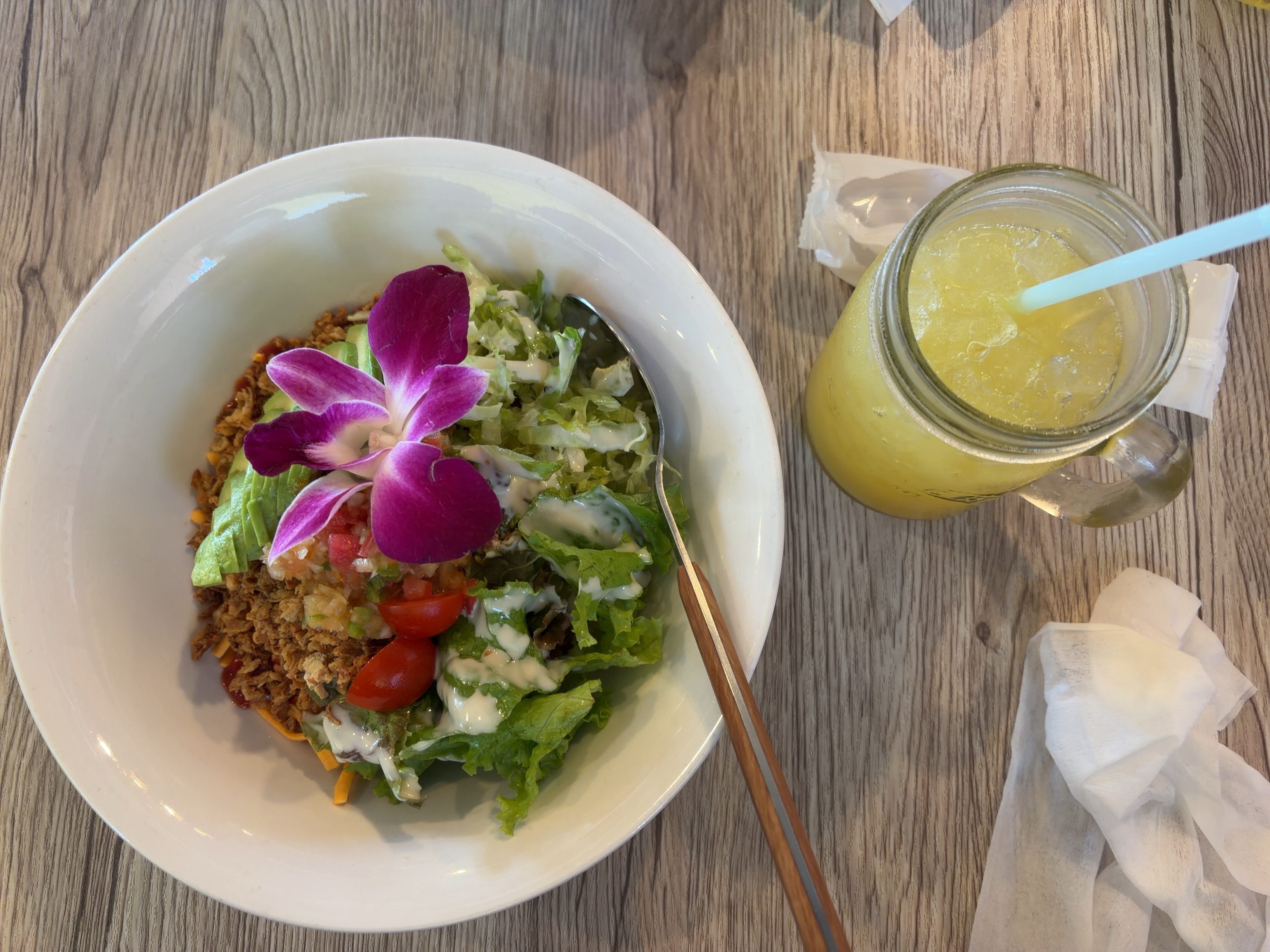 「RICE BOWL FACTORY(ライス・ボウル・ファクトリー)」という店に入った。海の家風の店で、若者が多いと気後れしそうだが、幸い誰もいなかった。RBFボウルとパインジュースのセットを注文。一般的なタコライスとビジュアルは違うが、味はそれほど意外感はなかった。