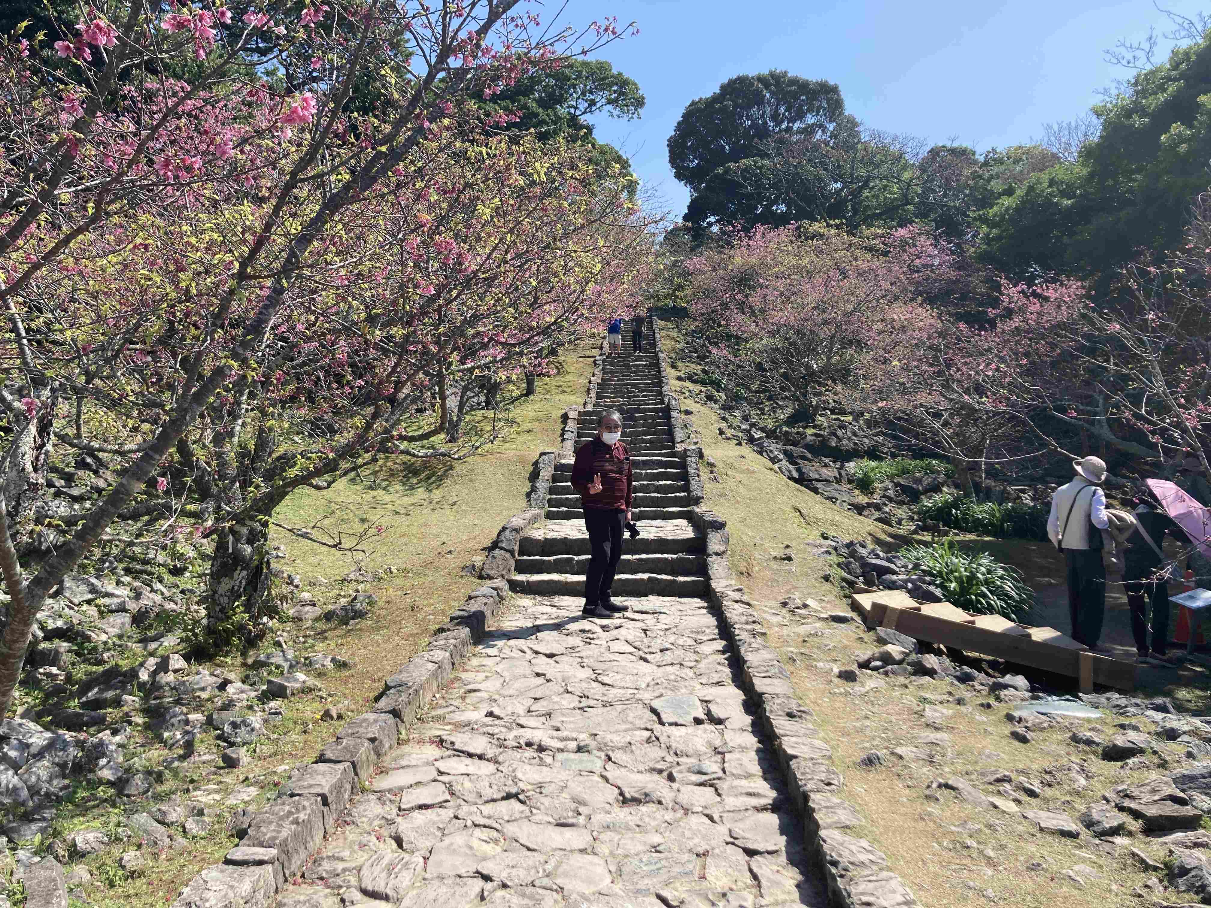 今帰仁城は、琉球王国成立以前(14世紀)に存在した北山の国王・北山王の居城で、国の史跡、世界文化遺産の一部に指定されている。城壁の石垣は、本土の城にもよく見られる野面積みだが、うねるような曲線状に積まれていて、とても優雅な印象を受ける。入口である平郎門から城の中心部へと向かう階段は後に整備されたものである。階段の左右には寒緋桜の並木があり、桜の名所になっているが、残念ながら盛りを過ぎていた。
