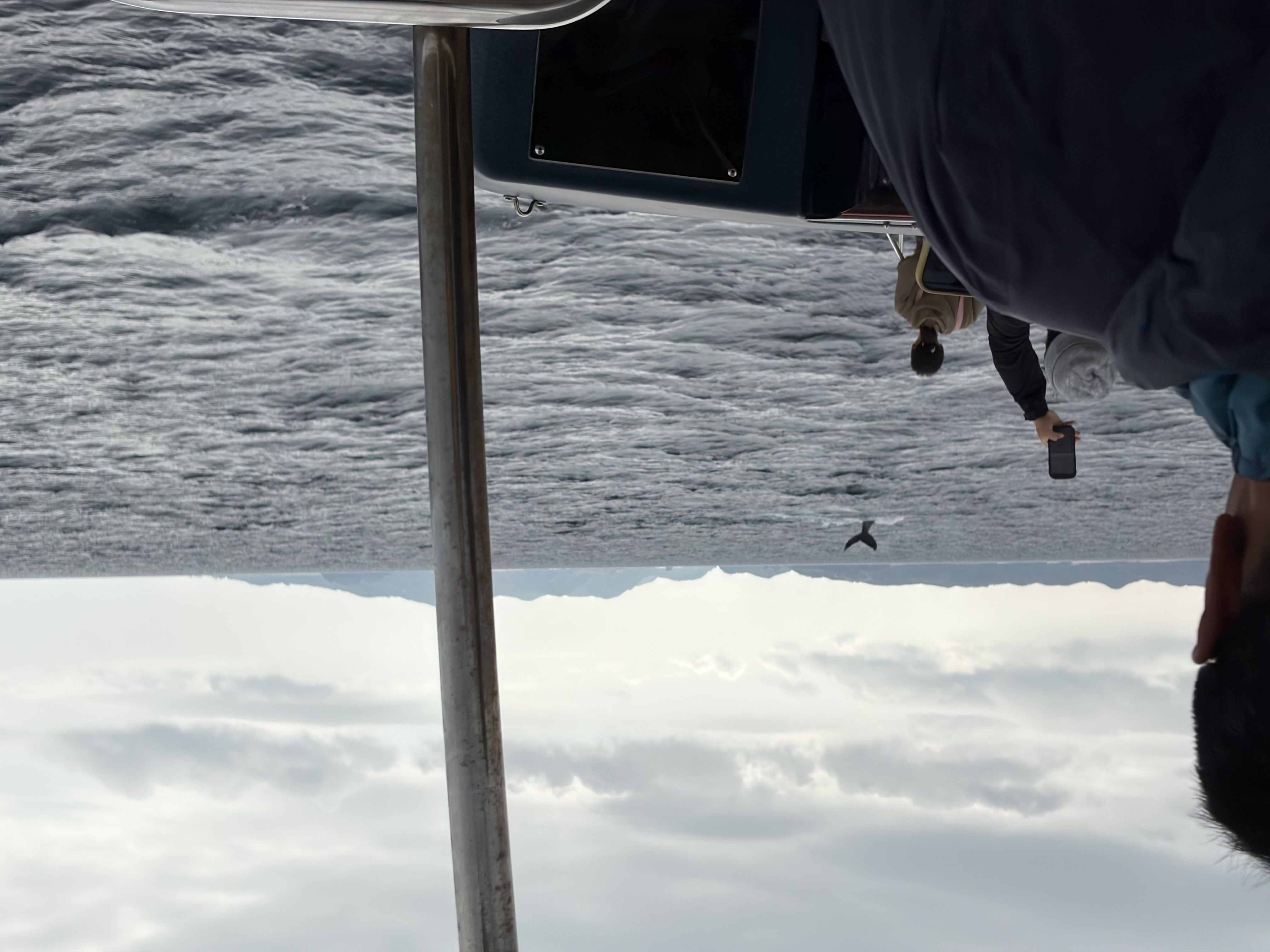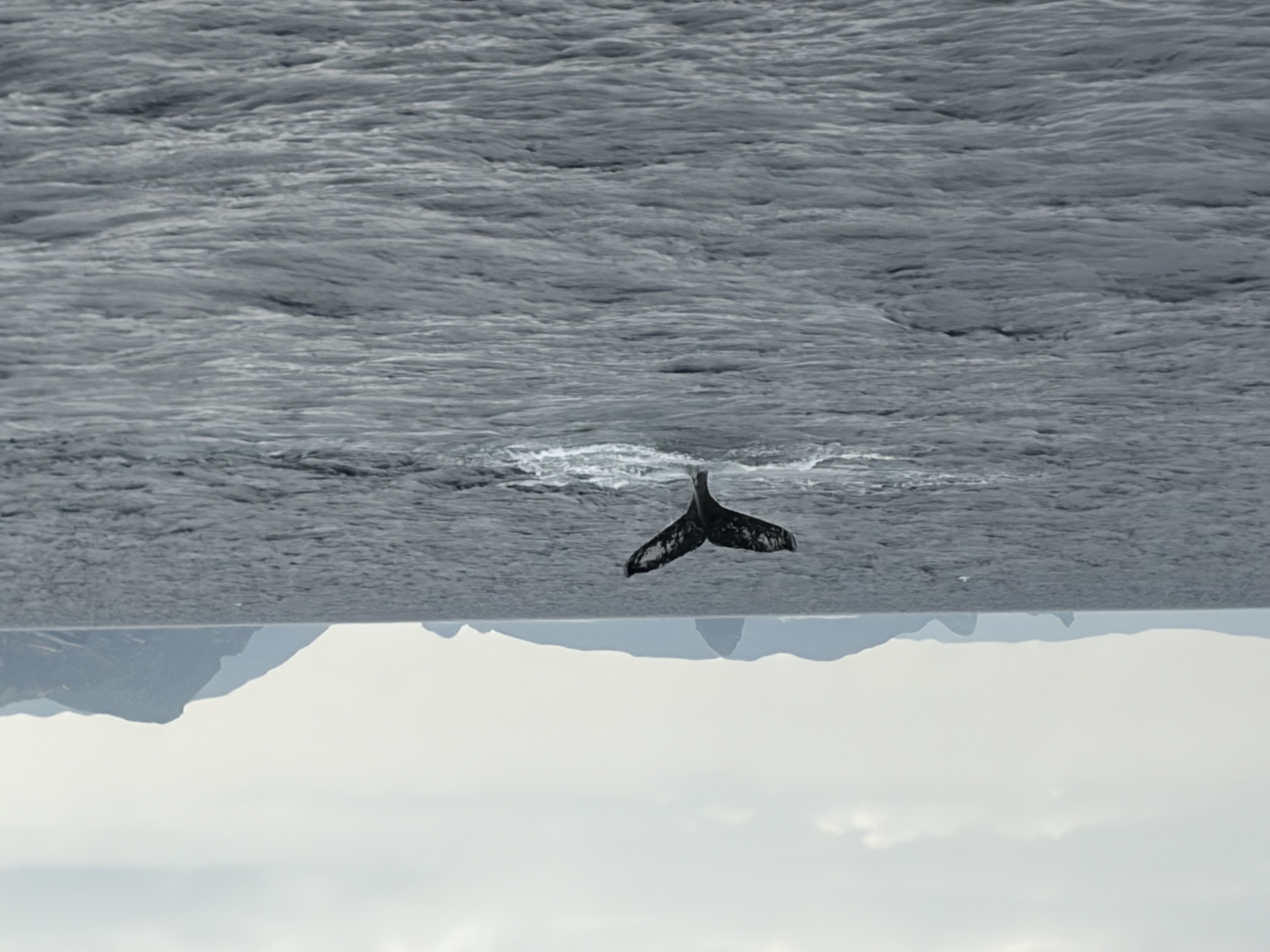 クジラが2頭、潮を吹いたり、尾を海面に叩きつけたりして暴れていた。クジラの動きに合わせて、ボートも少しづつ移動する。クジラがボートに向かってきたときはさすがに緊張した。しかし、最後まで巨大な勇姿を海面に現すことはなかった。期待したほどの盛り上がりもなく、1時間で終了。これでも運が良い方らしい。